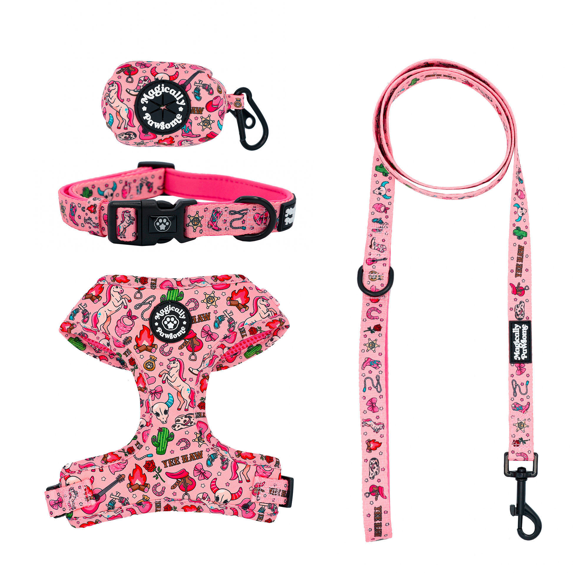 This set includes a stylish harness, durable leash, comfortable collar, and a convenient waste bag holder. Perfect for every magical adventure with your pup! 🌟🐾